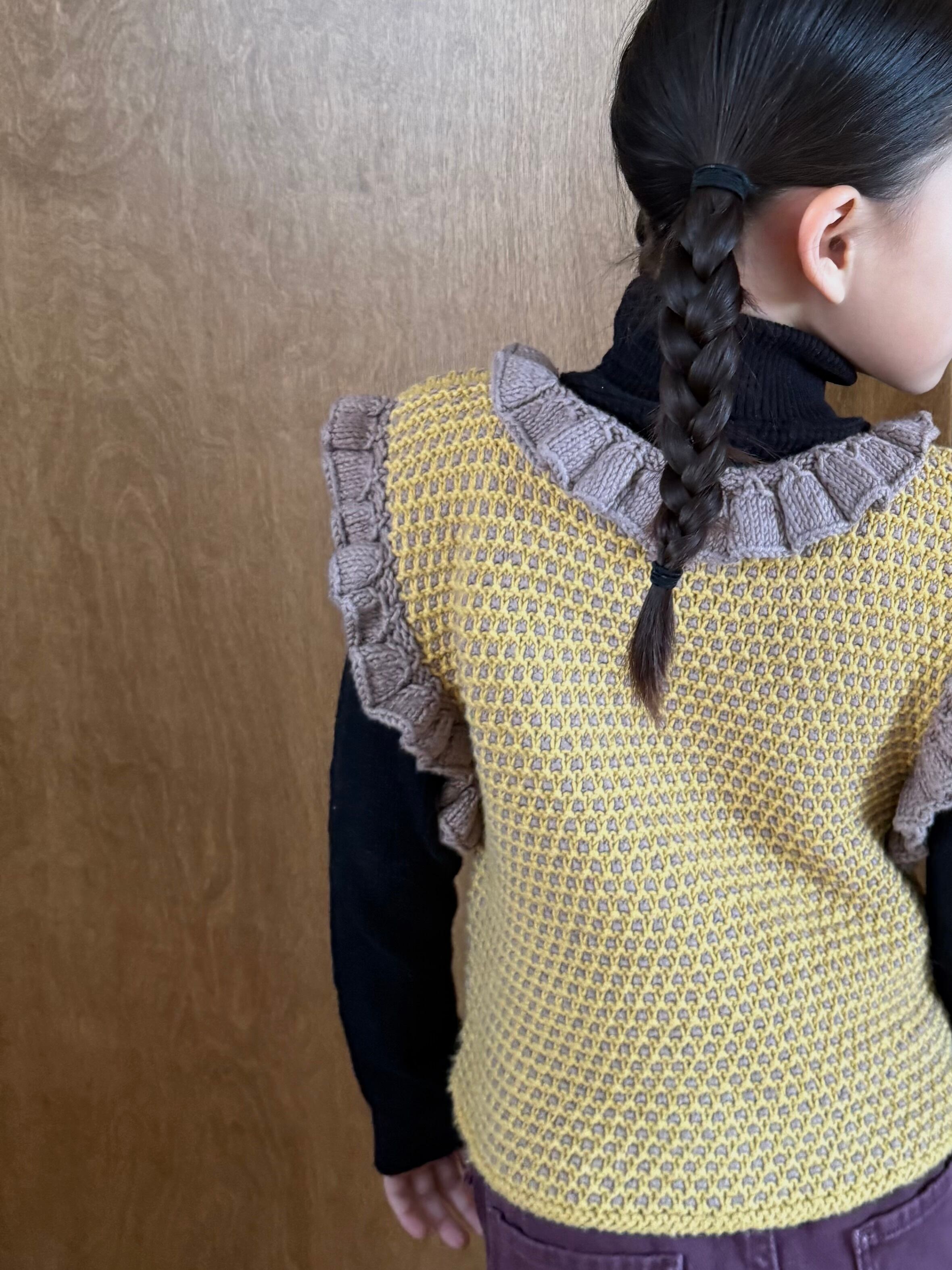 2カラー配色のモザイク柄と襟と袖にあしらったフリルがポイントに、可愛らしさを引き立てます。